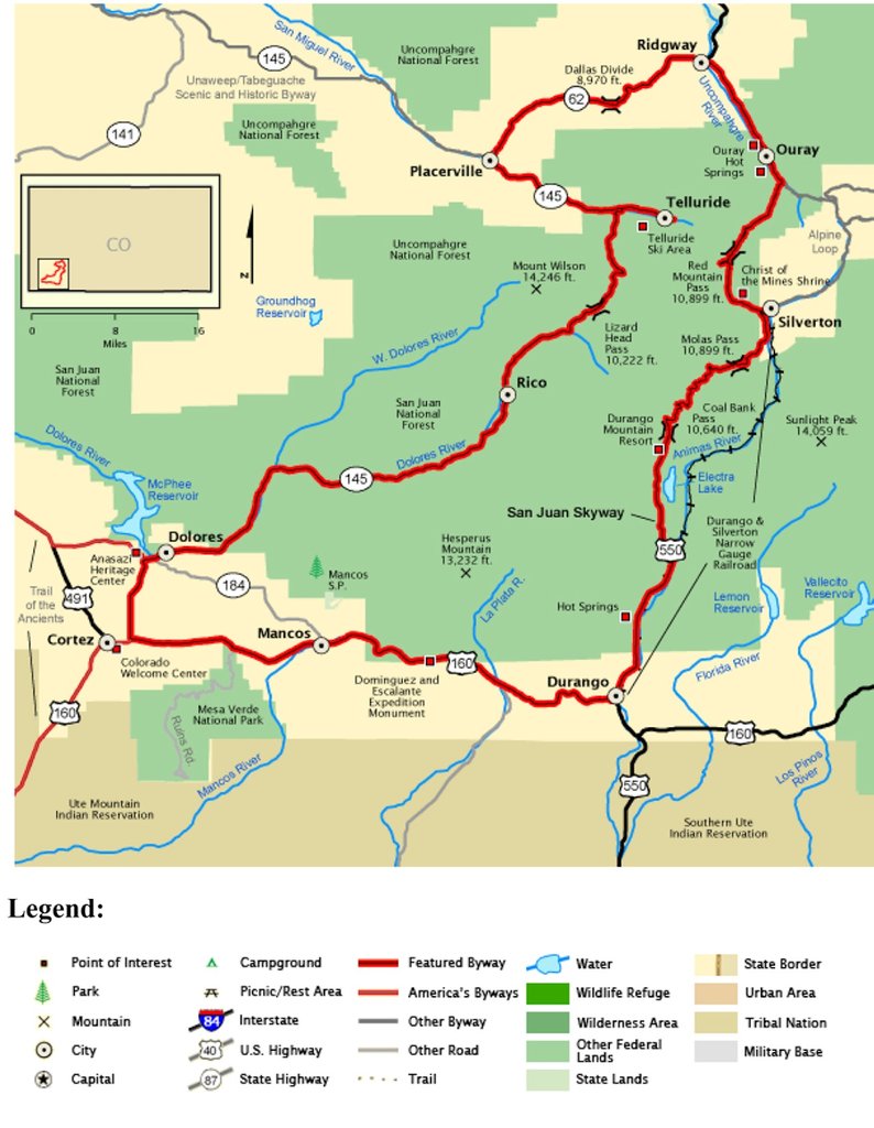 US160 & then CO184, west of Durango to Dolores, is also mostly four-lane.  All the major highways are very well maintained by the Colorado Highway Dept.  From Dolores north to Telluride on CO145, it is continually uphill, climaxing at Lizard Head Pass, 10,222ft., just south of Telluride.  Once you drive past Dolores, the scenery is spectacular!  Be prepared to see some steep drop-offs and some hair-pin turns.